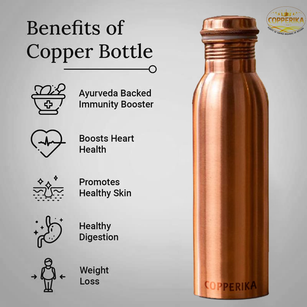Copperika Pure Copper Water Bottle 750ml Original With Ayurvedic & Other Health | Heavy Build | 100% Leak Proof | BPA Free Benefits For Home, Office, Kids & Yoga