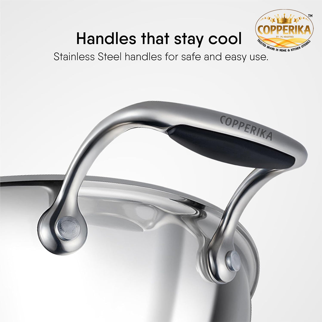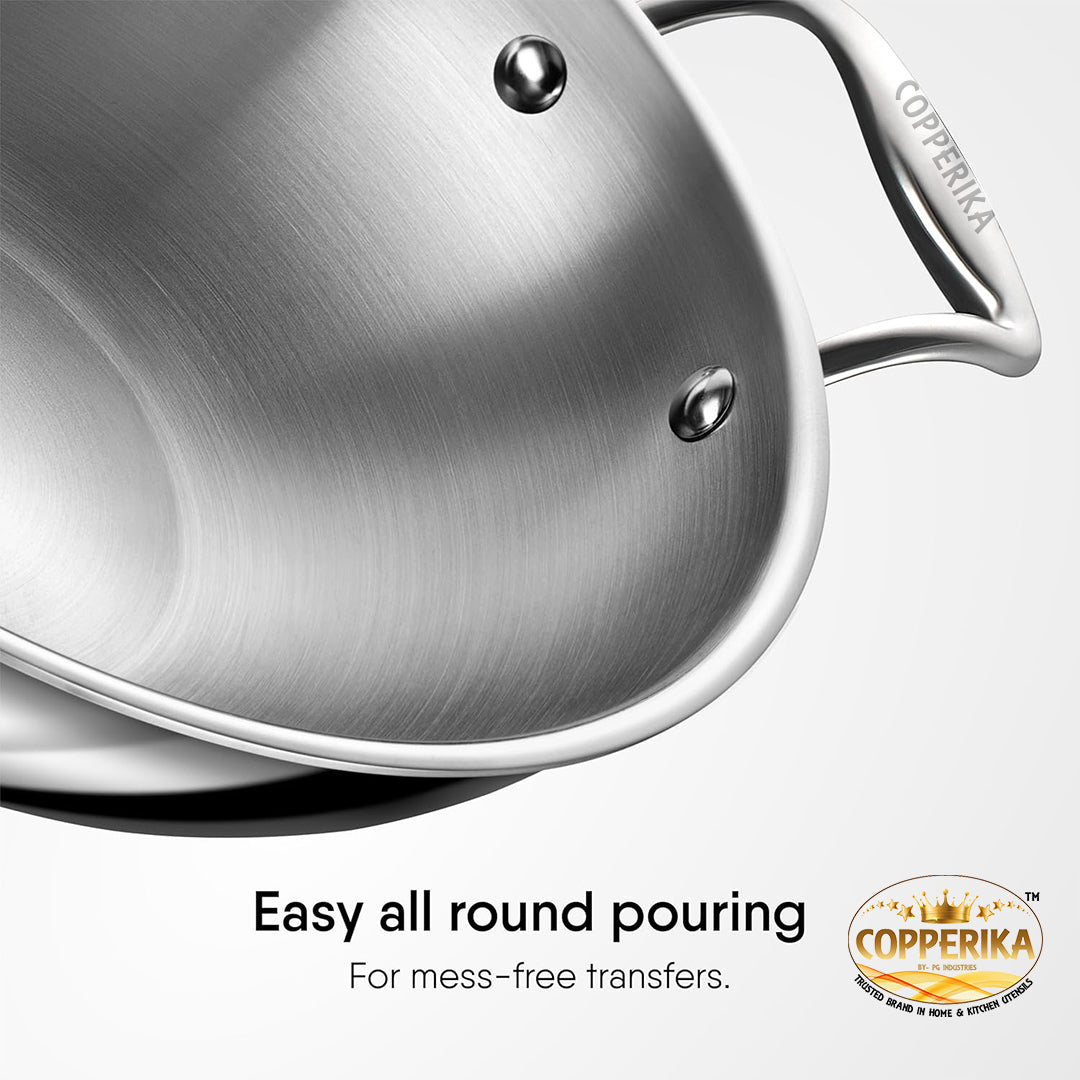 - Copperika TriPro TriPly Stainless Steel 24cm Kadai with Stainless Steel Lid, 3 Litres Kadhai with Lid, Metal Spatula Friendly, Easy to Clean, Heavy Build, Induction Bottom and Gas Stove Ready - Silver